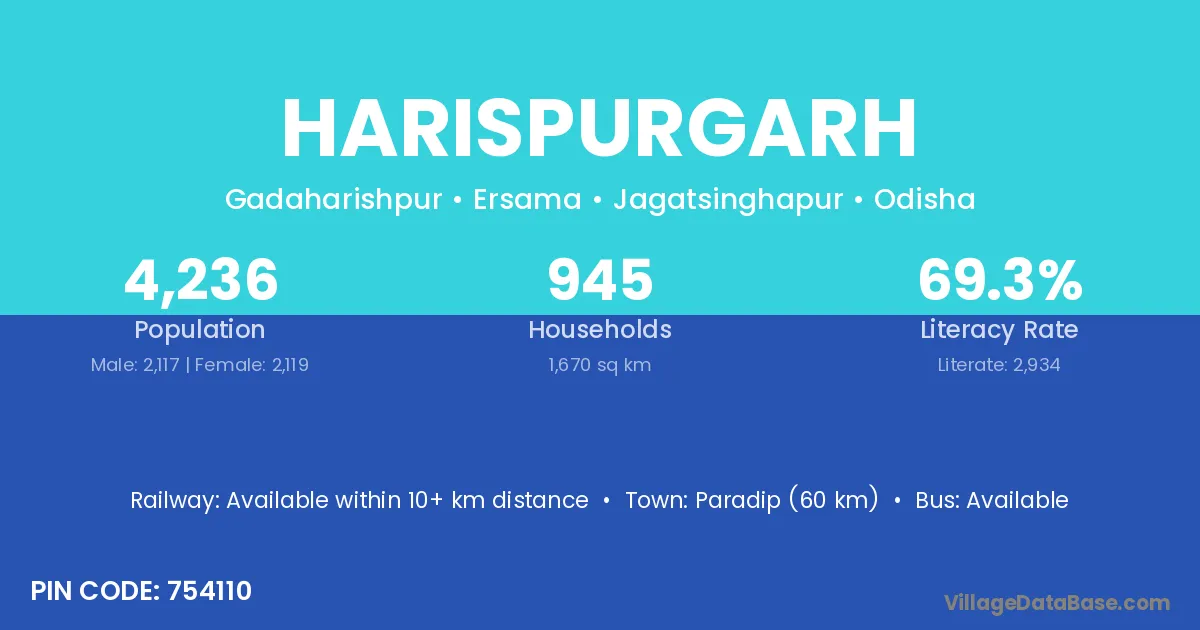 Paradip (60 km) is the nearest town to Harispurgarh village for major economic activities and is located approximately 60 km away.