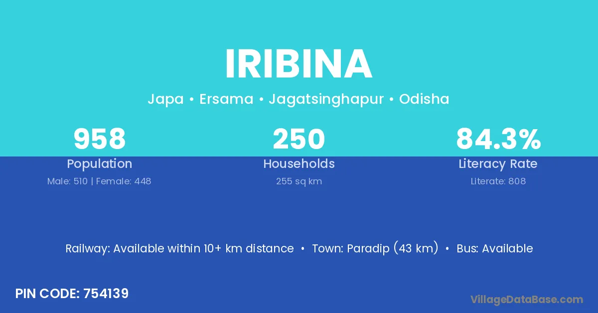 Paradip (43 km) is the nearest town to Iribina village for major economic activities and is located approximately 43 km away.