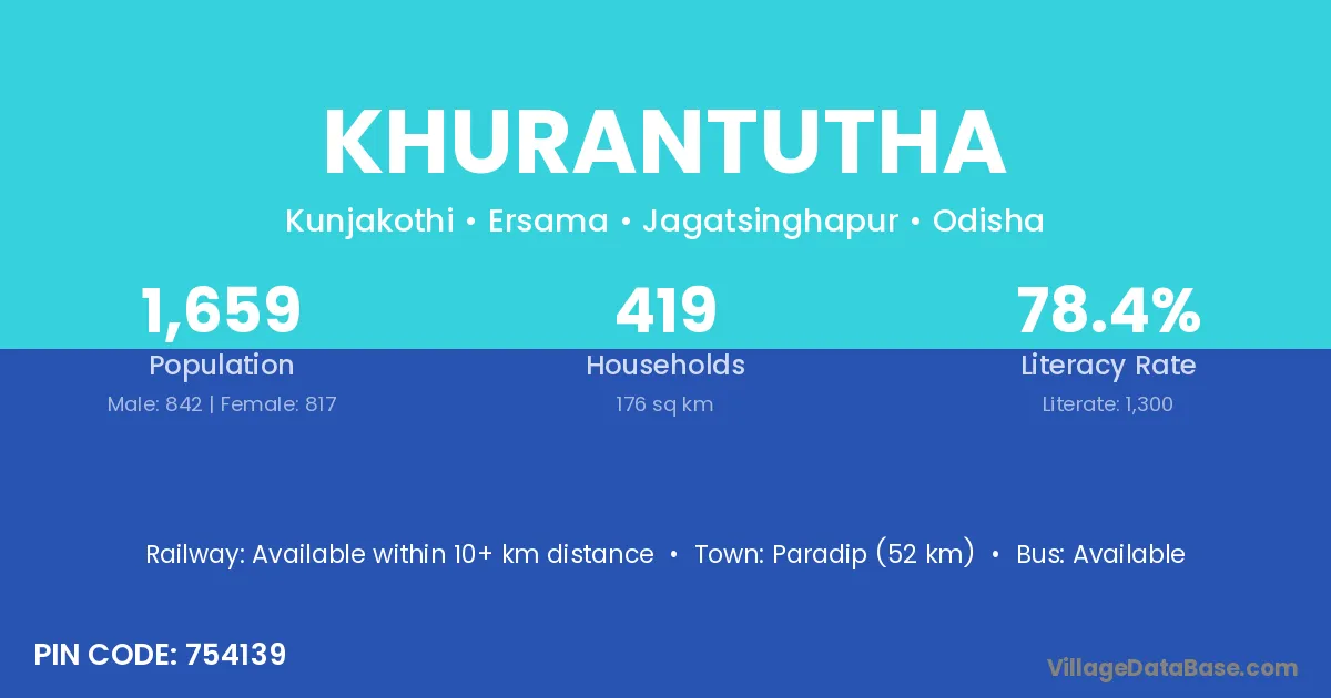 Paradip (52 km) is the nearest town to Khurantutha village for major economic activities and is located approximately 52 km away.