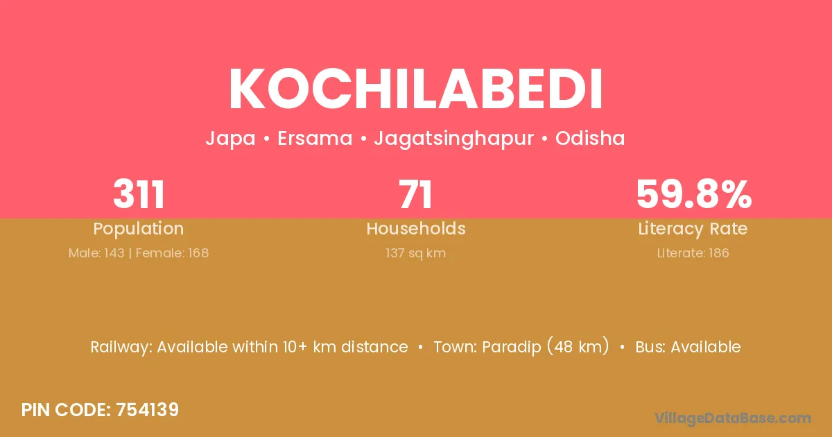 Paradip (48 km) is the nearest town to Kochilabedi village for major economic activities and is located approximately 48 km away.