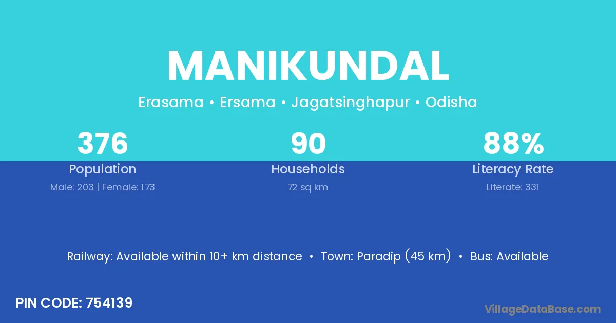 Paradip (45 km) is the nearest town to Manikundal village for major economic activities and is located approximately 45 km away.
