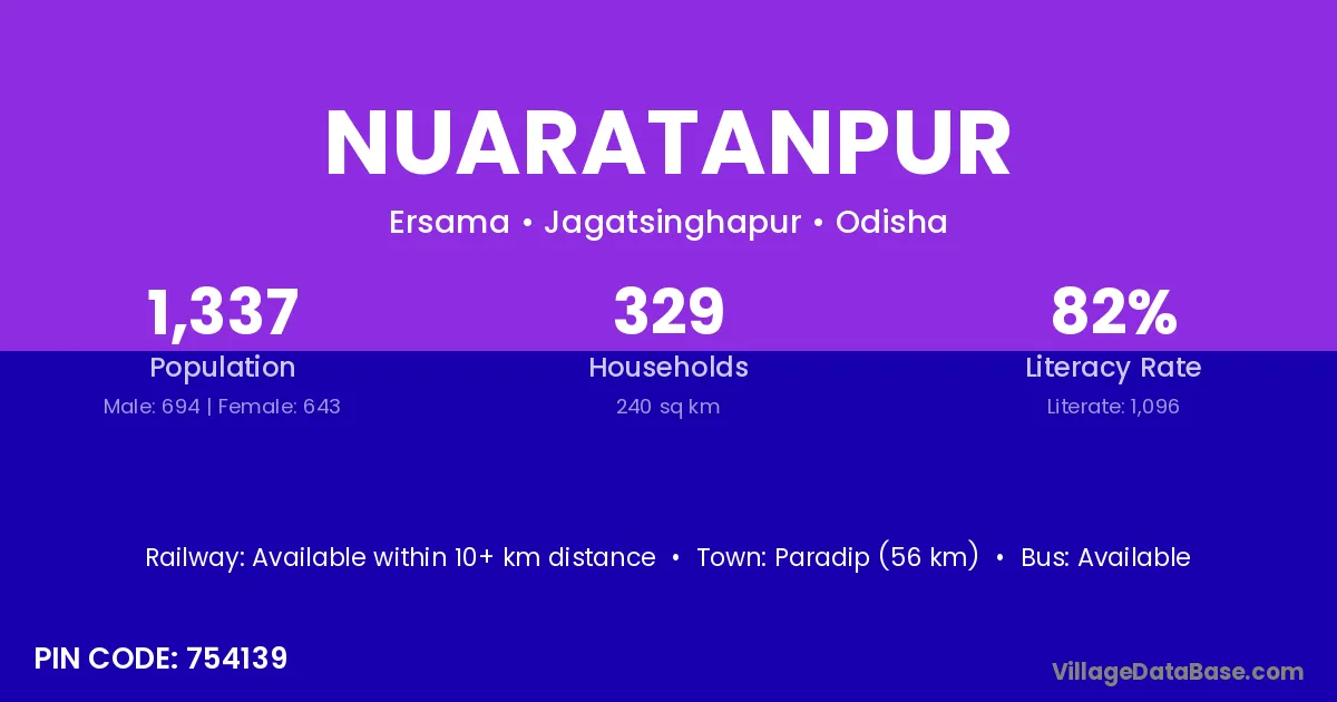 Paradip (56 km) is the nearest town to Nuaratanpur village for major economic activities and is located approximately 56 km away.