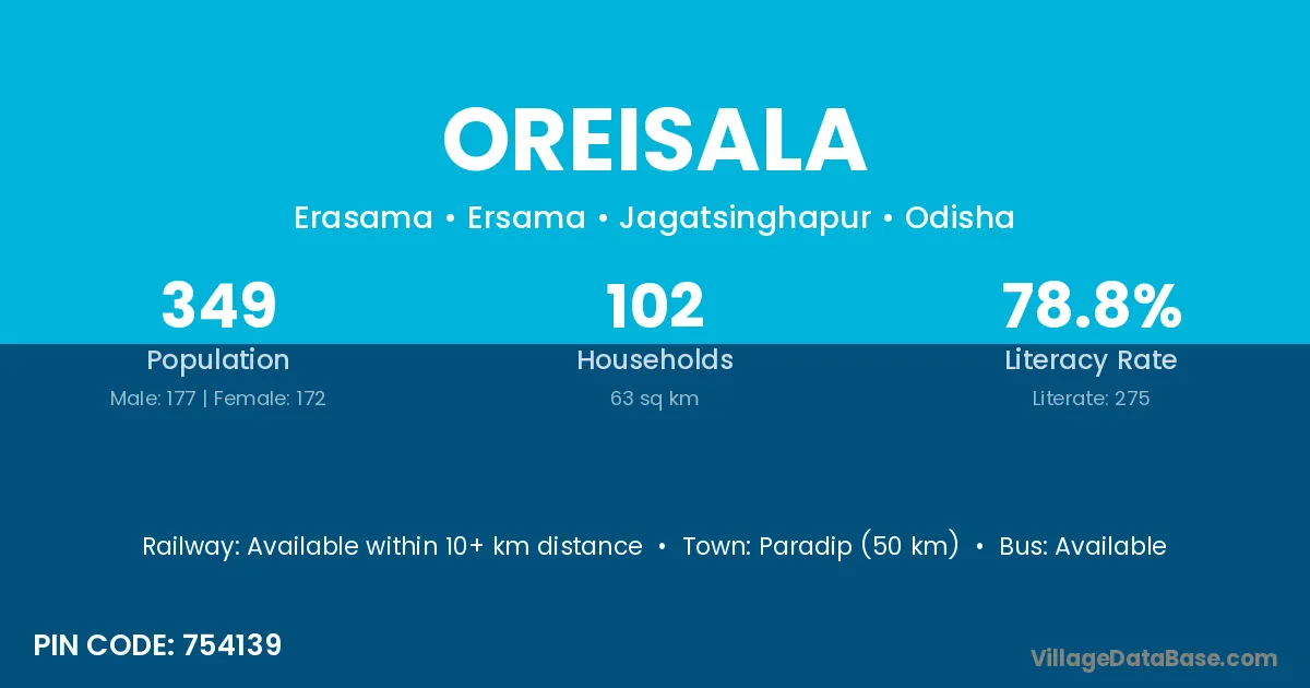 Paradip (50 km) is the nearest town to Oreisala village for major economic activities and is located approximately 50 km away.