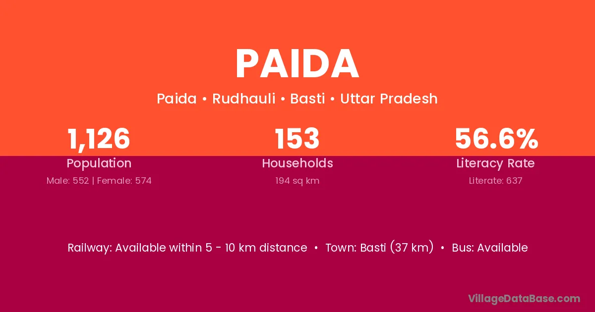 The literacy rate of Paida village is 70.26%. Male literacy stands at 73.52% and female literacy at 67.65%.
