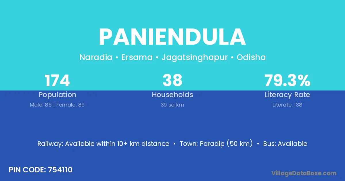 Paradip (50 km) is the nearest town to Paniendula village for major economic activities and is located approximately 50 km away.