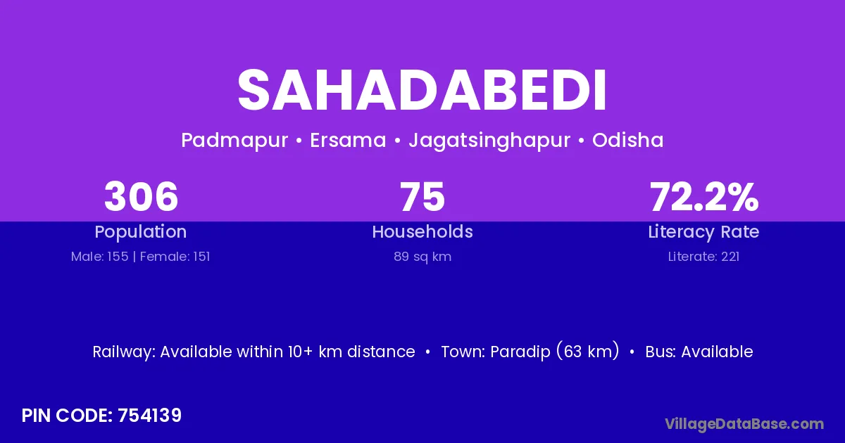 Paradip (63 km) is the nearest town to Sahadabedi village for major economic activities and is located approximately 63 km away.