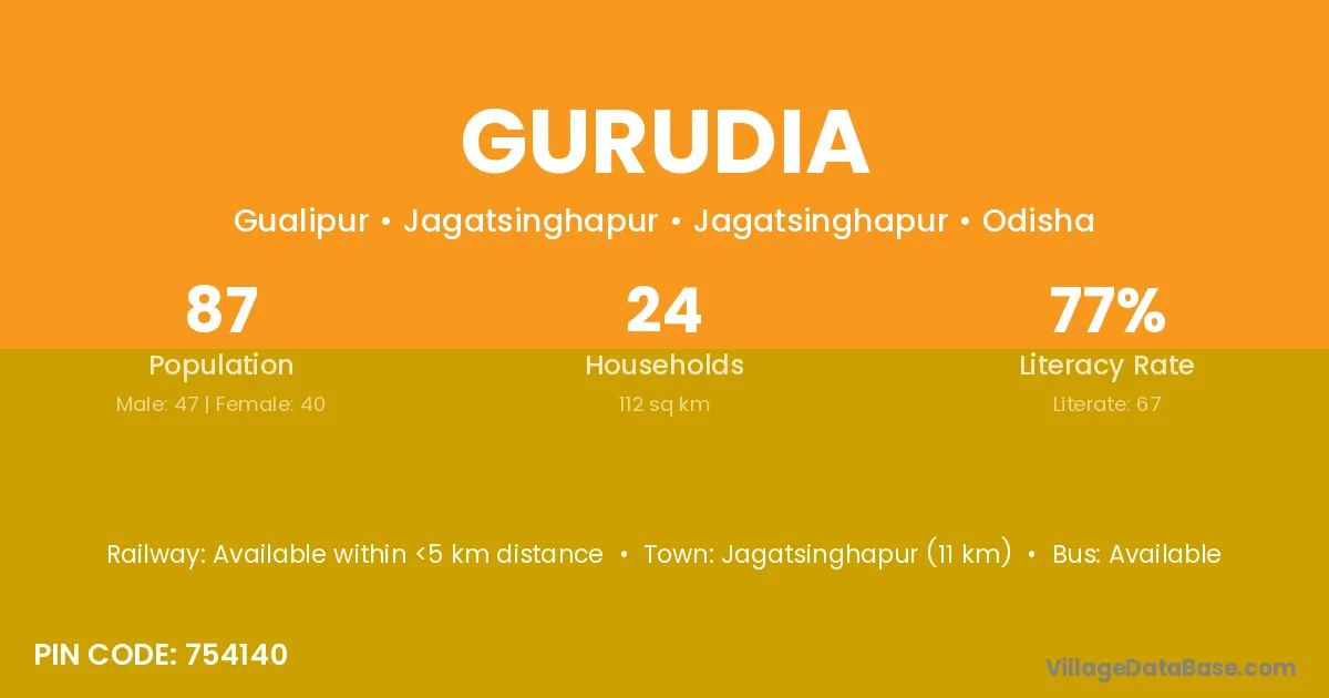 Jagatsinghapur (11 km) is the nearest town to Gurudia village for major economic activities and is located approximately 11 km away.