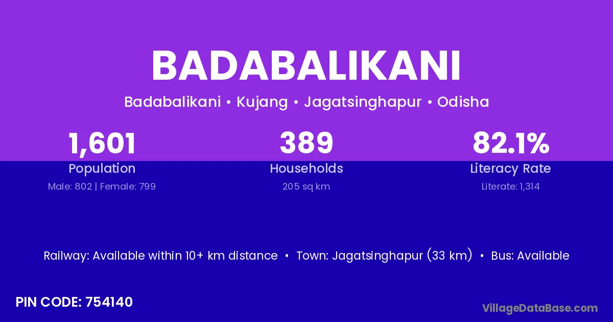 Jagatsinghapur (33 km) is the nearest town to Badabalikani village for major economic activities and is located approximately 33 km away.