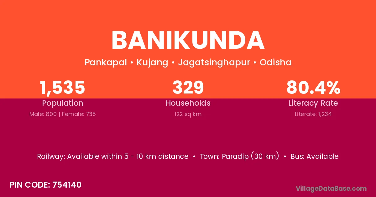 Paradip (30 km) is the nearest town to Banikunda village for major economic activities and is located approximately 30 km away.