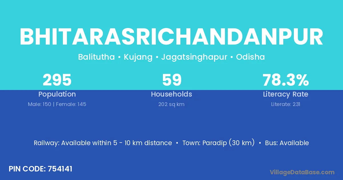 Bhitarasrichandanpur village has a total population of 295 people, of which 150 are males and 145 are females.