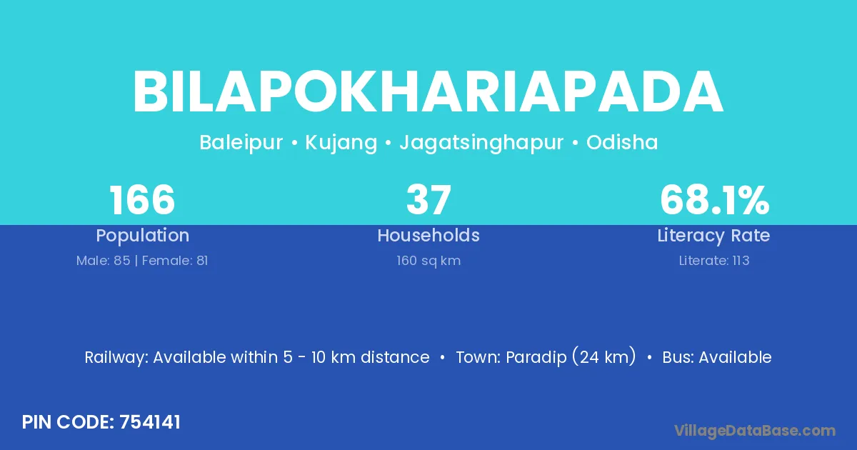 Paradip (24 km) is the nearest town to Bilapokhariapada village for major economic activities and is located approximately 24 km away.