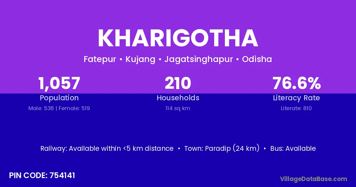 Paradip (24 km) is the nearest town to Kharigotha village for major economic activities and is located approximately 24 km away.