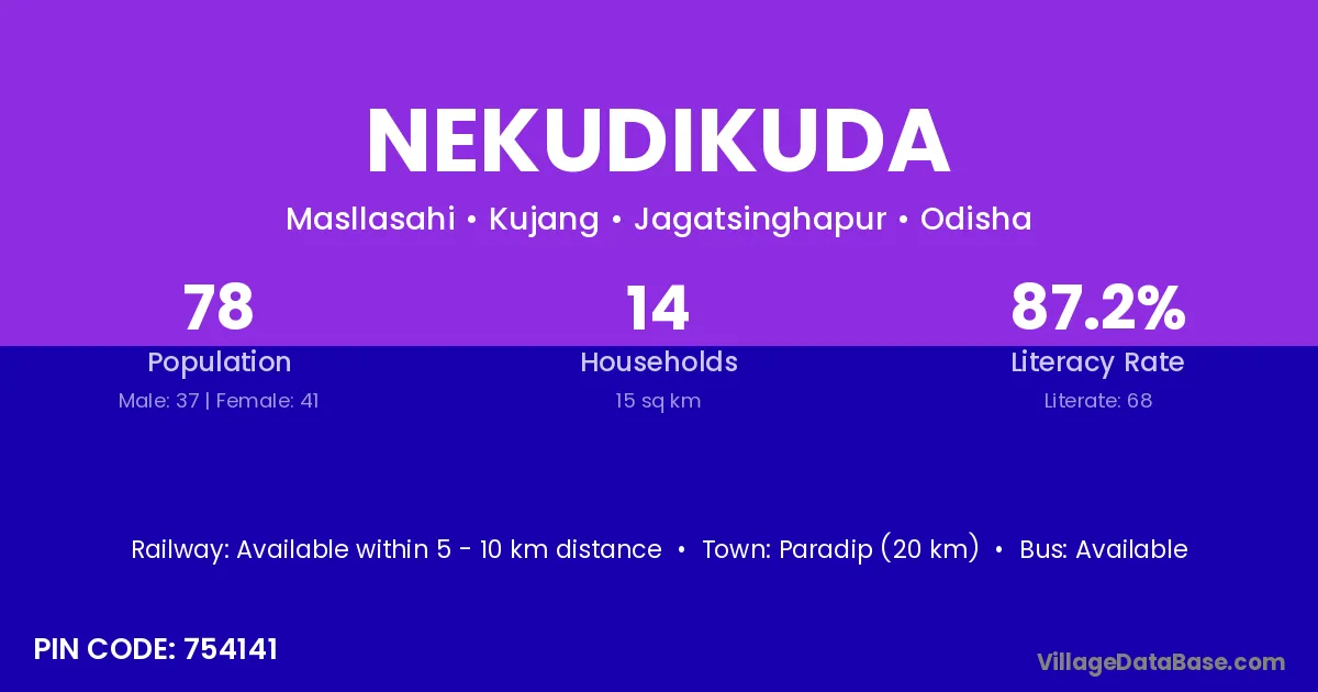 Paradip (20 km) is the nearest town to Nekudikuda village for major economic activities and is located approximately 20 km away.