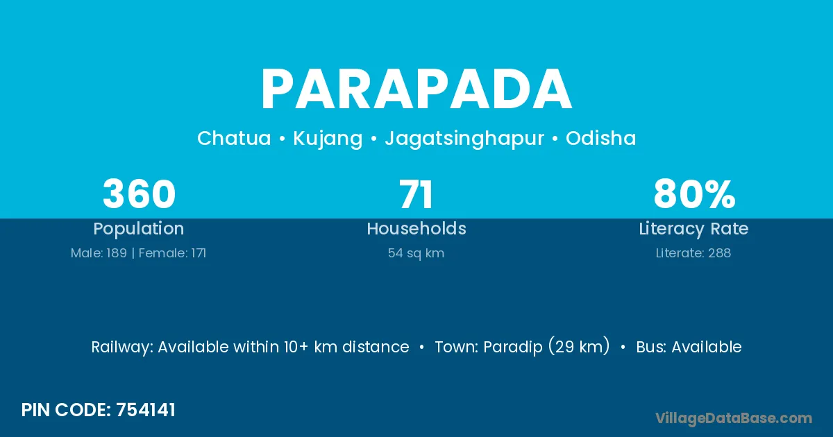 Paradip (29 km) is the nearest town to Parapada village for major economic activities and is located approximately 29 km away.