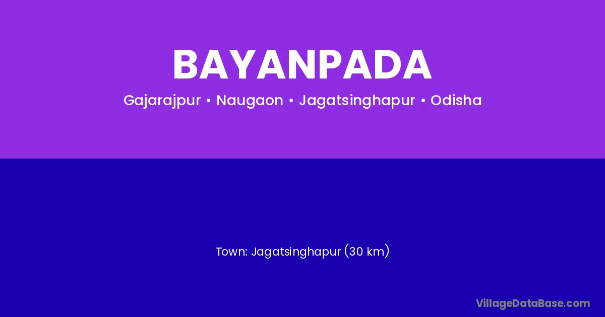 Jagatsinghapur (30 km) is the nearest town to Bayanpada village for major economic activities and is located approximately 30 km away.