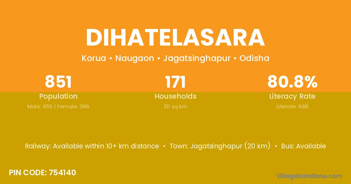 Jagatsinghapur (20 km) is the nearest town to Dihatelasara village for major economic activities and is located approximately 20 km away.