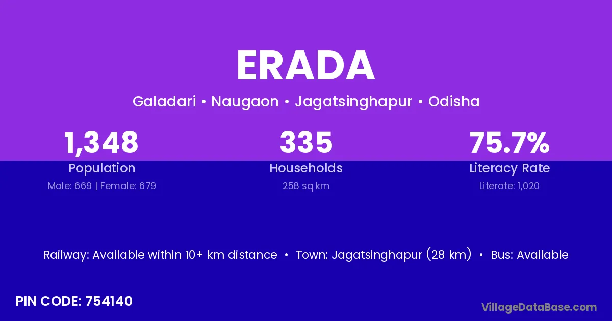 Jagatsinghapur (28 km) is the nearest town to Erada village for major economic activities and is located approximately 28 km away.