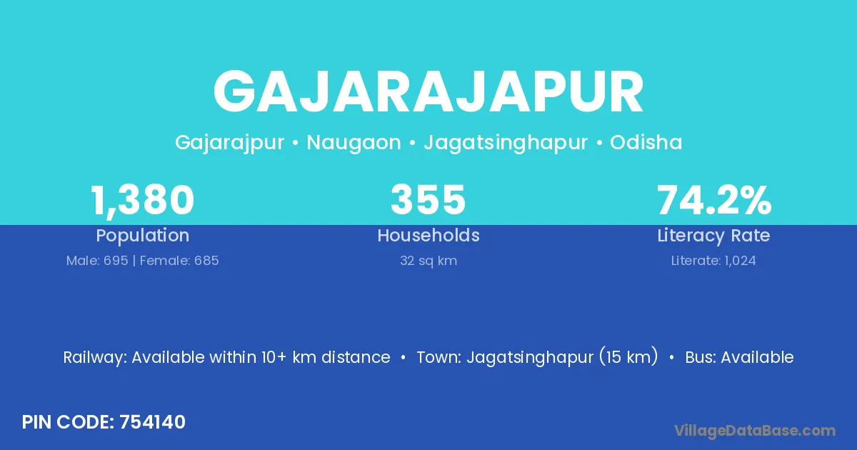 Jagatsinghapur (15 km) is the nearest town to Gajarajapur village for major economic activities and is located approximately 15 km away.