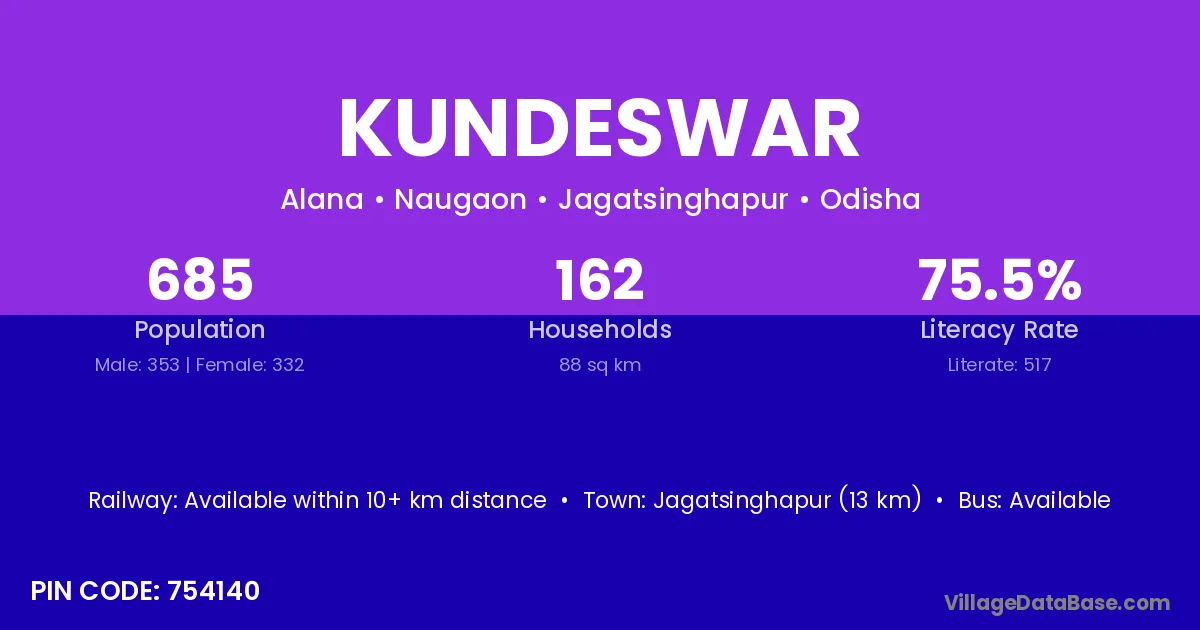 Kundeswar village has a total population of 685 people, of which 353 are males and 332 are females.