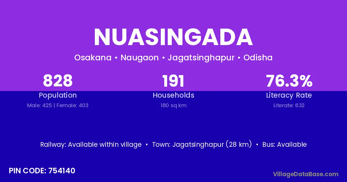 Jagatsinghapur (28 km) is the nearest town to Nuasingada village for major economic activities and is located approximately 28 km away.