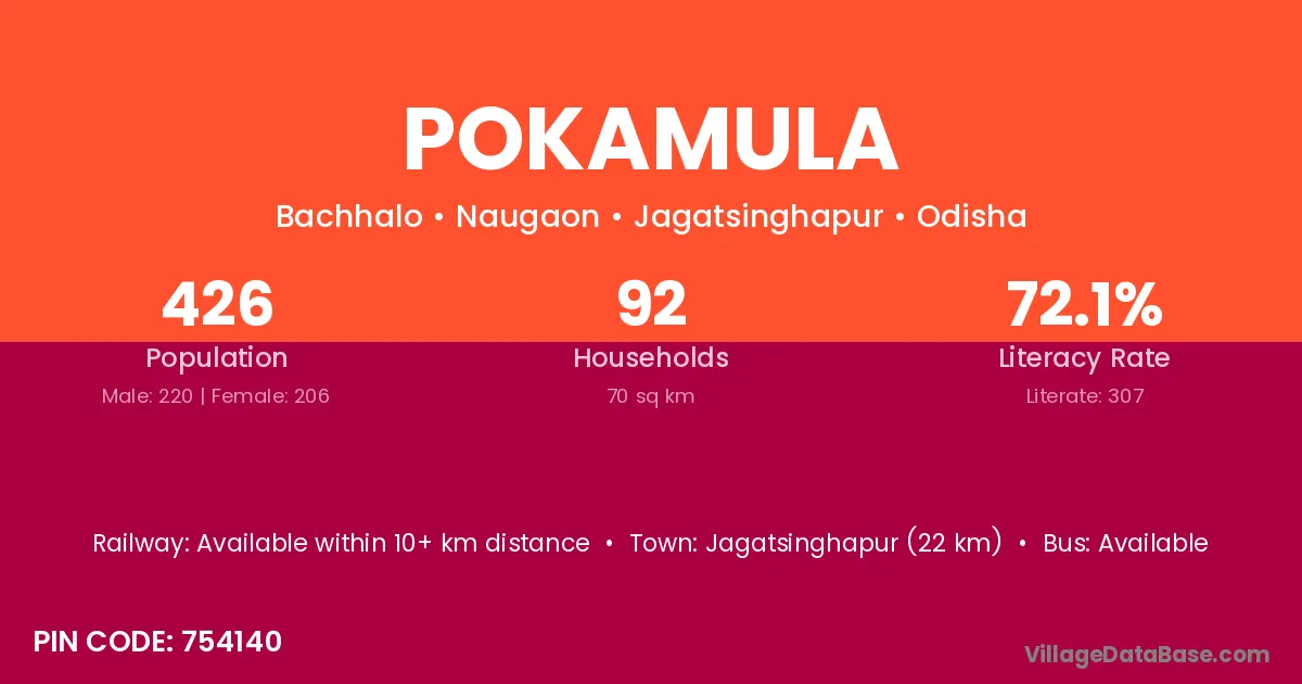 Jagatsinghapur (22 km) is the nearest town to Pokamula village for major economic activities and is located approximately 22 km away.