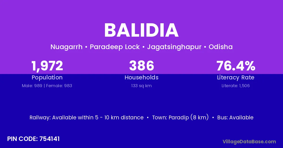 Paradip (8 km) is the nearest town to Balidia village for major economic activities and is located approximately 8 km away.