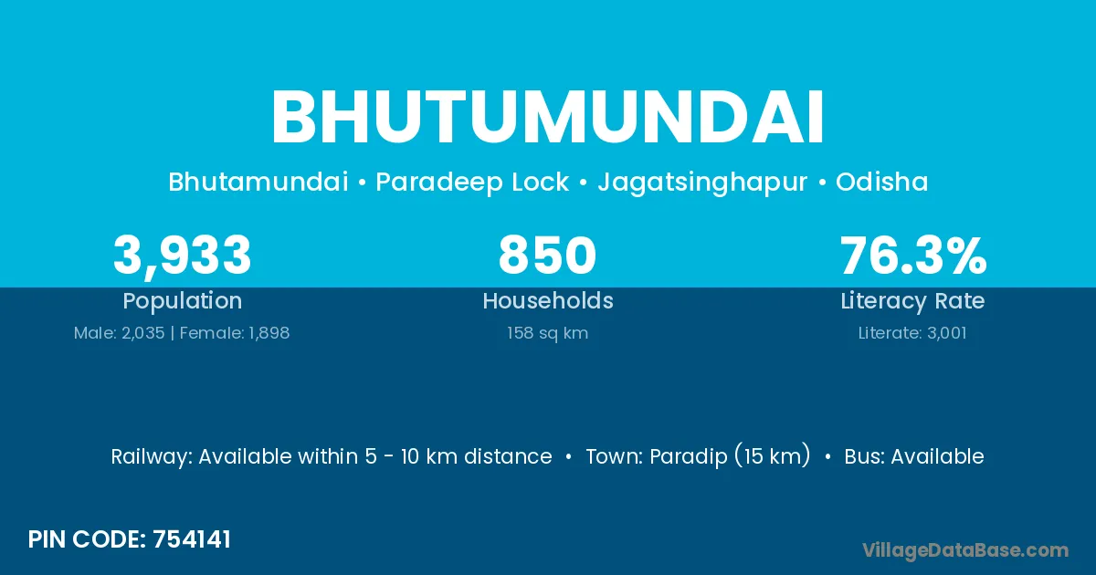 Paradip (15 km) is the nearest town to Bhutumundai village for major economic activities and is located approximately 15 km away.