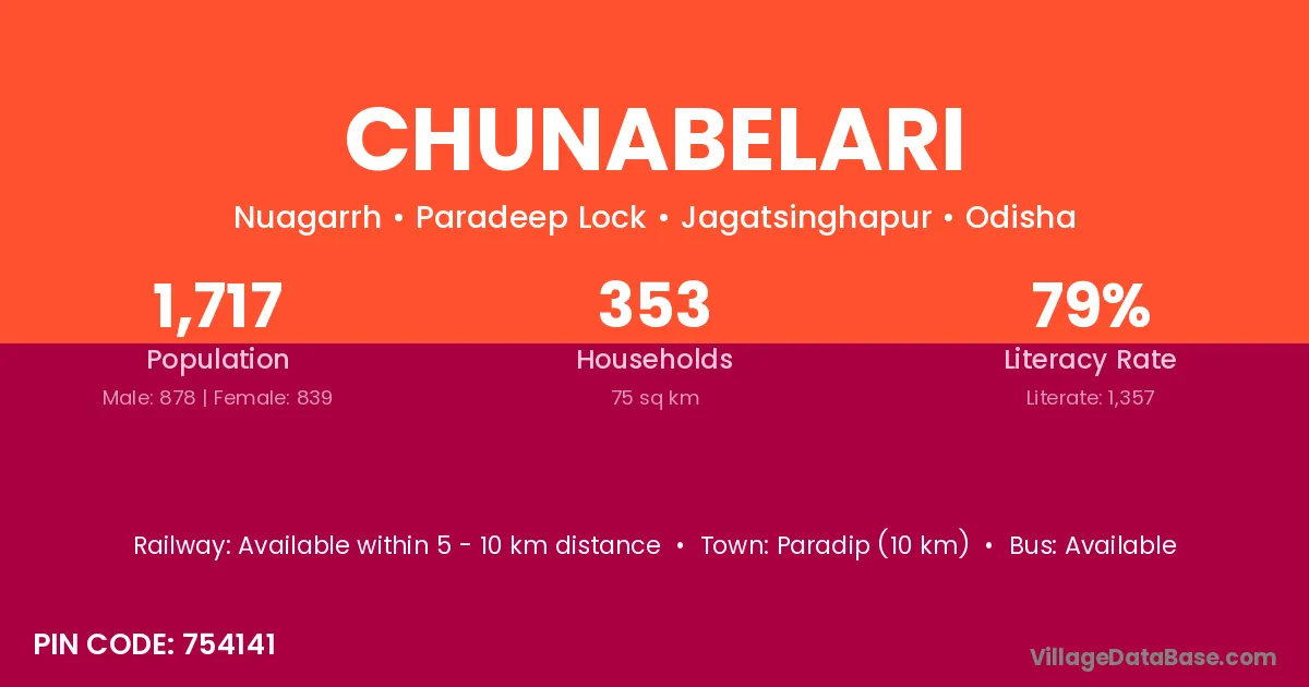 Paradip (10 km) is the nearest town to Chunabelari village for major economic activities and is located approximately 10 km away.