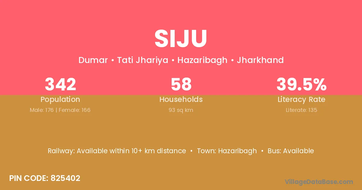 The literacy rate of Siju village is 78.05%. Male literacy stands at 84.79% and female literacy at 71.13%.