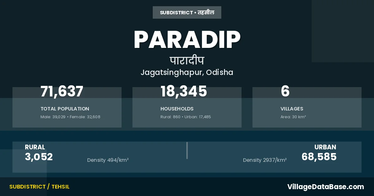 According to the 2011 census The total area of Paradip Tehsil is 30 km², with a population of 71637 people. The population density is 2,426 inhabitants per square kilometre, and there are approximately 18345 houses in the sub district.