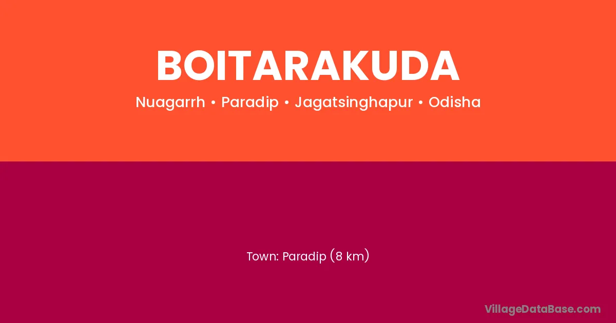 Paradip (8 km) is the nearest town to Boitarakuda village for major economic activities and is located approximately 8 km away.