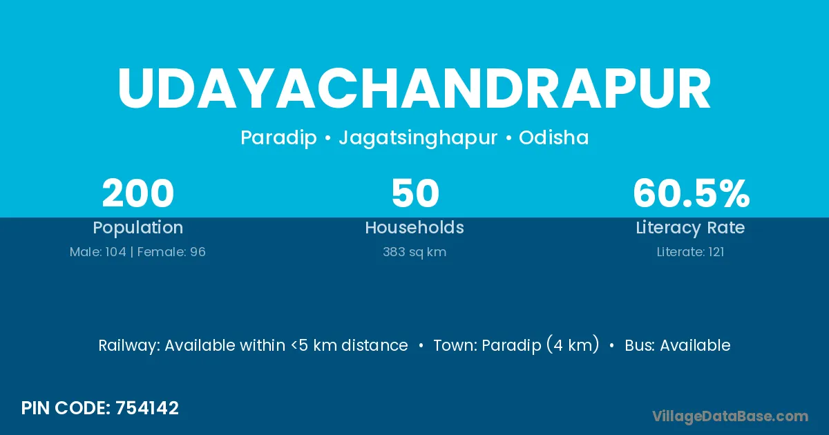 Paradip (4 km) is the nearest town to Udayachandrapur village for major economic activities and is located approximately 4 km away.