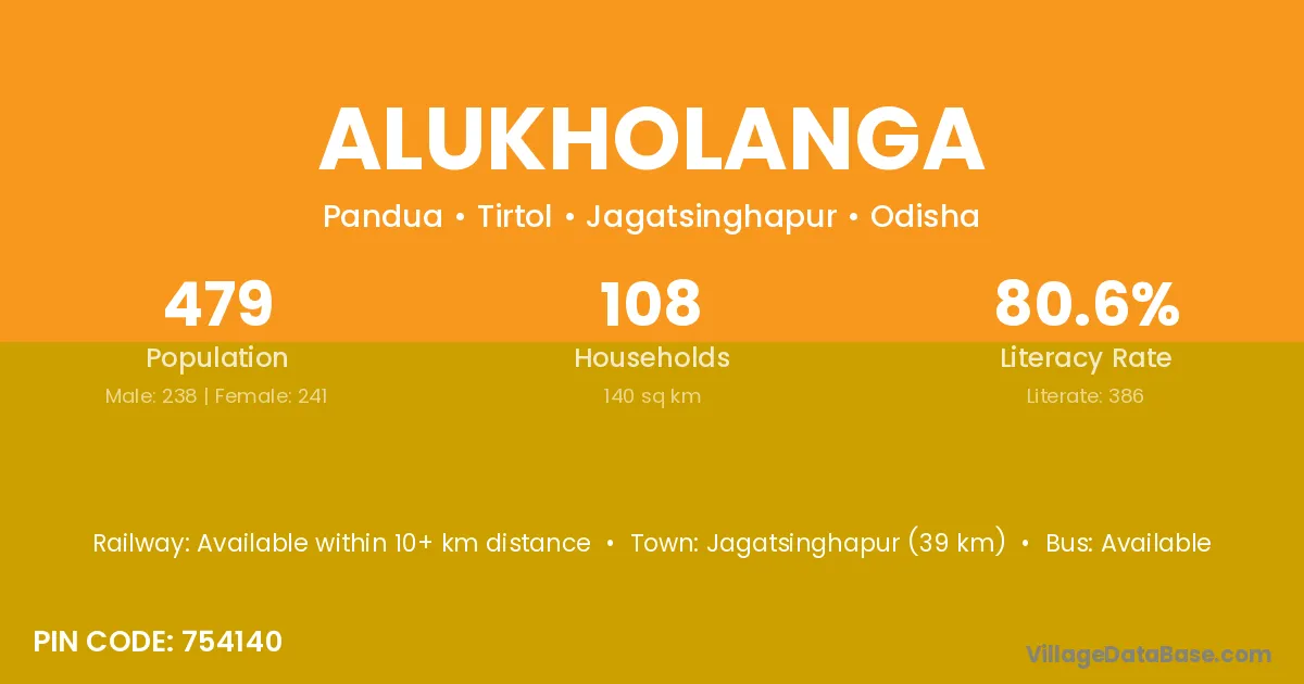 Jagatsinghapur (39 km) is the nearest town to Alukholanga village for major economic activities and is located approximately 39 km away.