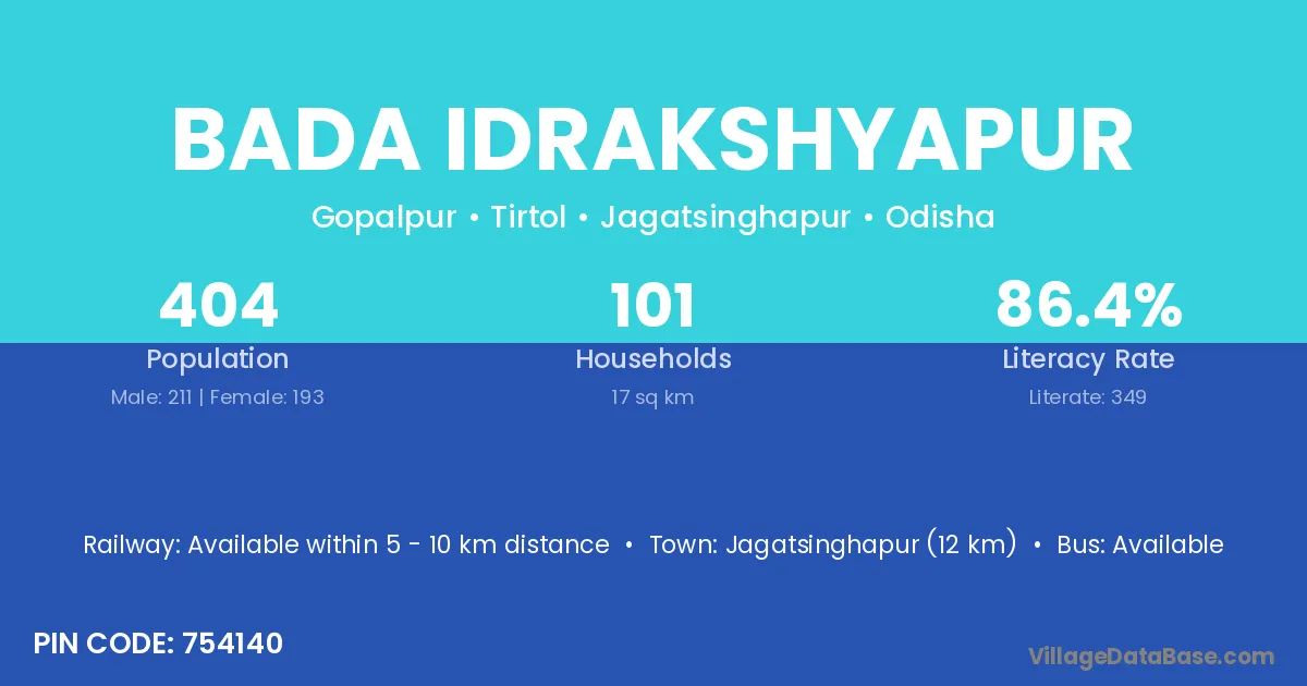 Jagatsinghapur (12 km) is the nearest town to Bada Idrakshyapur village for major economic activities and is located approximately 12 km away.