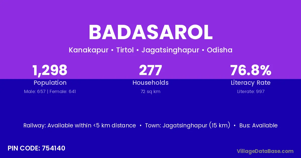 Jagatsinghapur (15 km) is the nearest town to Badasarol village for major economic activities and is located approximately 15 km away.