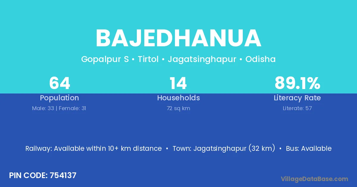 Jagatsinghapur (32 km) is the nearest town to Bajedhanua village for major economic activities and is located approximately 32 km away.