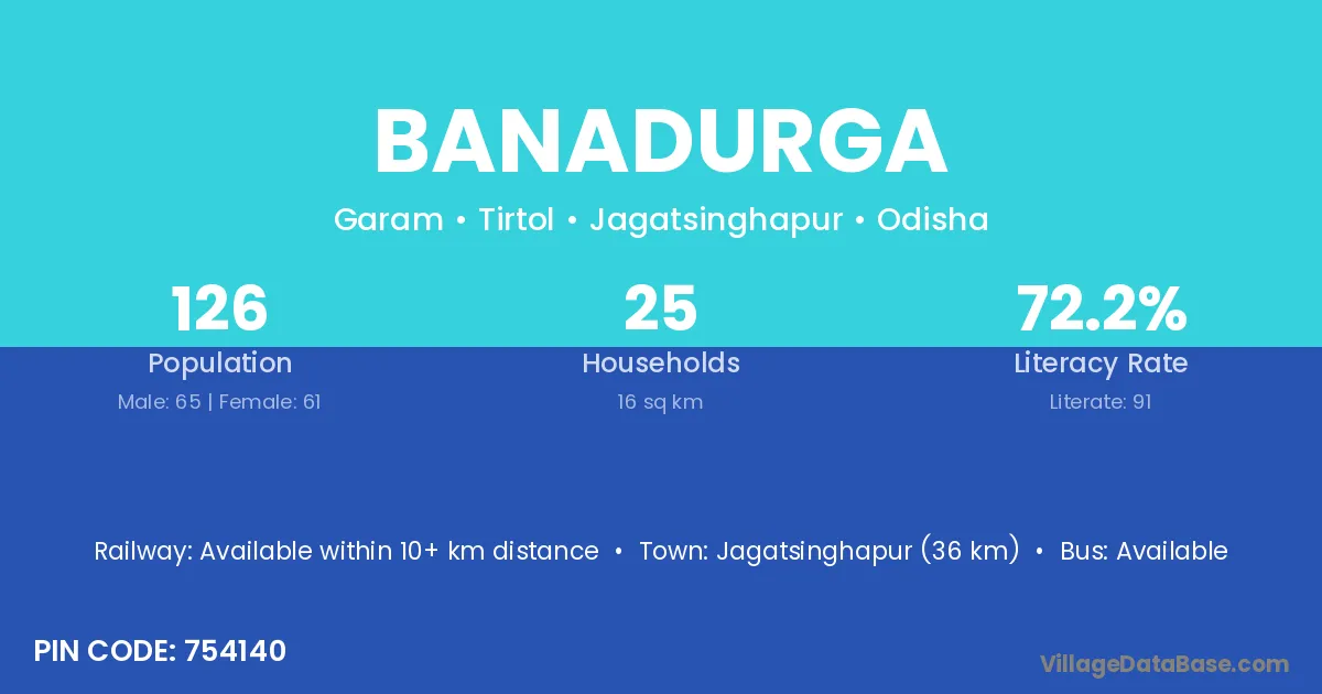 Jagatsinghapur (36 km) is the nearest town to Banadurga village for major economic activities and is located approximately 36 km away.