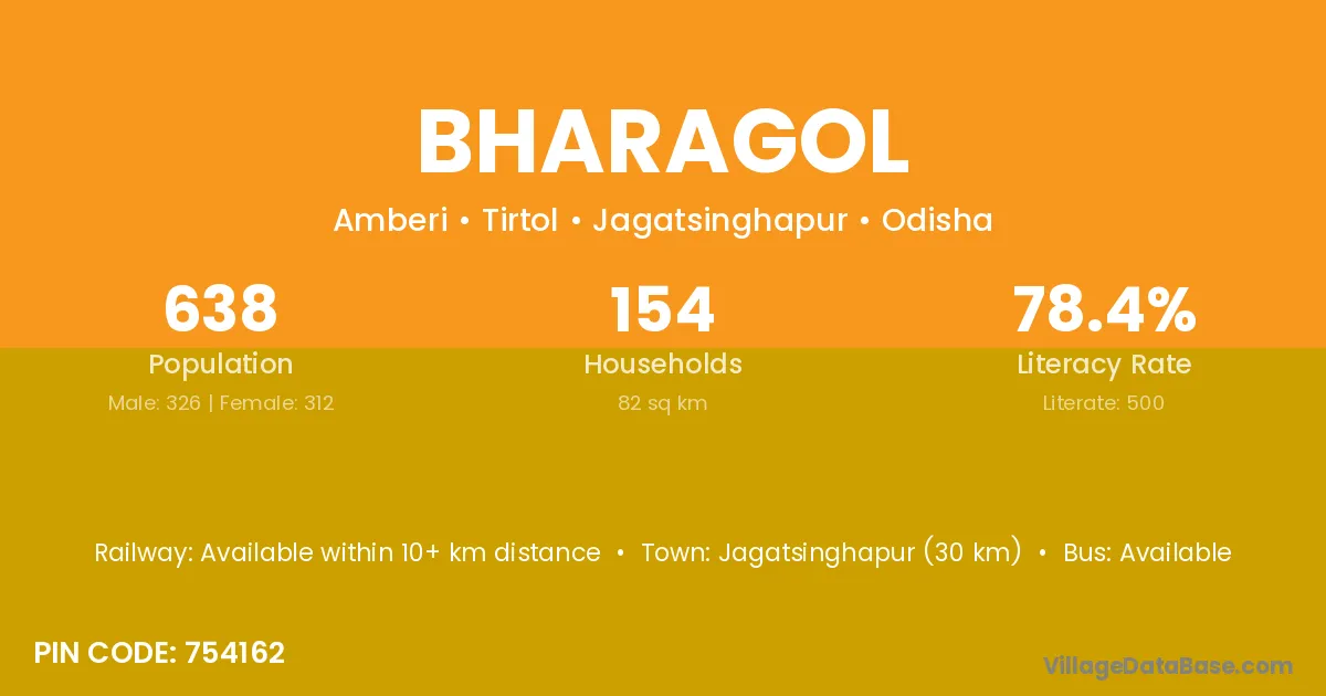 Jagatsinghapur (30 km) is the nearest town to Bharagol village for major economic activities and is located approximately 30 km away.