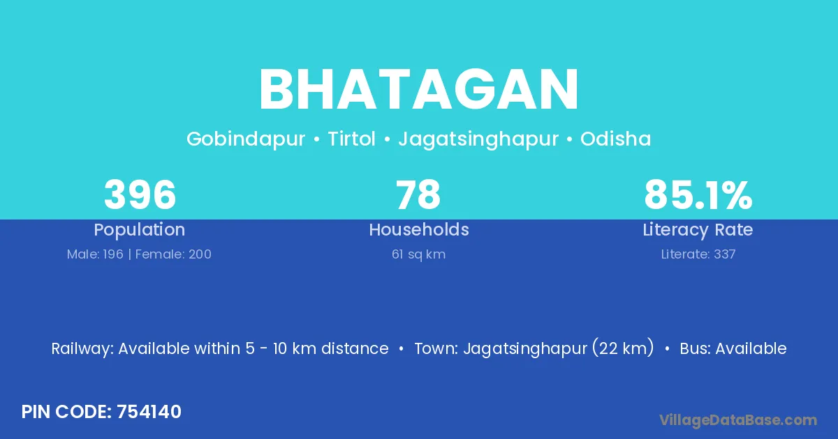 Jagatsinghapur (22 km) is the nearest town to Bhatagan village for major economic activities and is located approximately 22 km away.