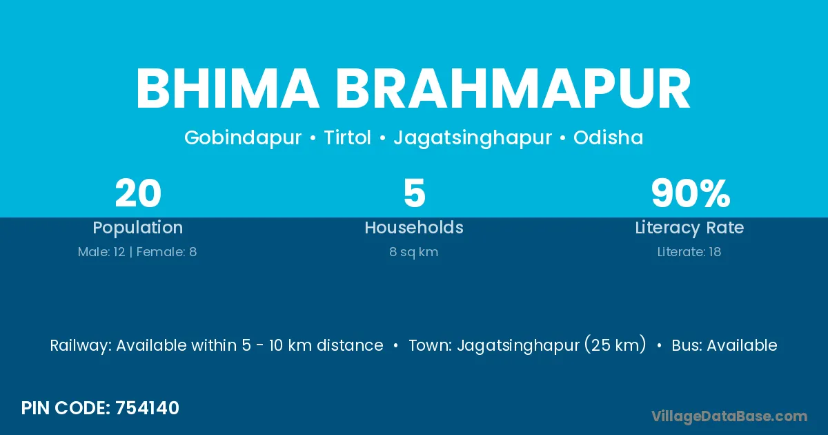 Bhima Brahmapur village has a total population of 20 people, of which 12 are males and 8 are females.