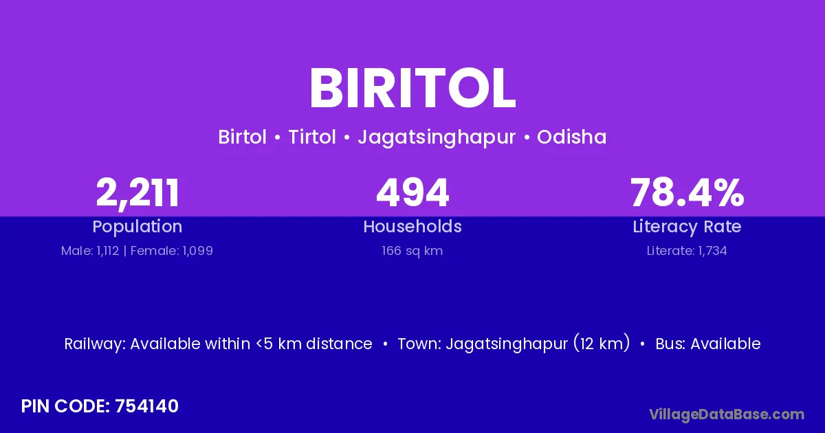 Jagatsinghapur (12 km) is the nearest town to Biritol village for major economic activities and is located approximately 12 km away.