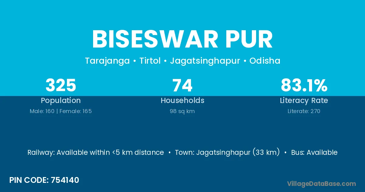 Jagatsinghapur (33 km) is the nearest town to Biseswar Pur village for major economic activities and is located approximately 33 km away.