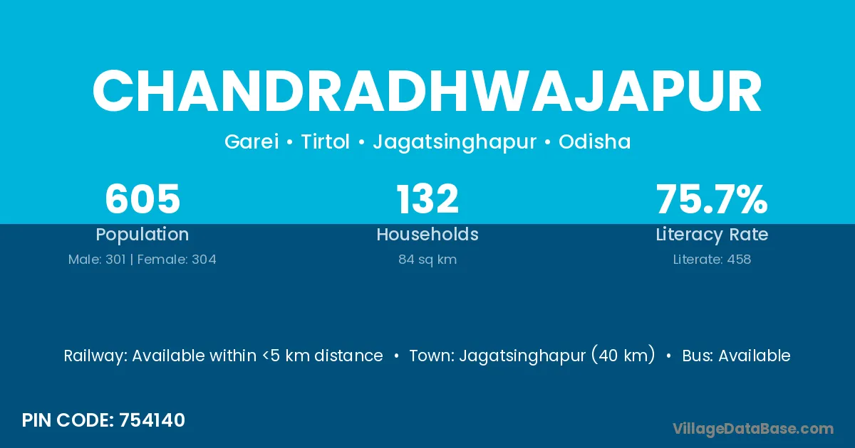 Chandradhwajapur village has a total population of 605 people, of which 301 are males and 304 are females.