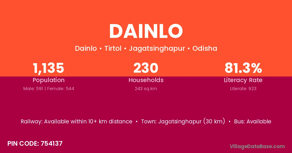 Jagatsinghapur (30 km) is the nearest town to Dainlo village for major economic activities and is located approximately 30 km away.