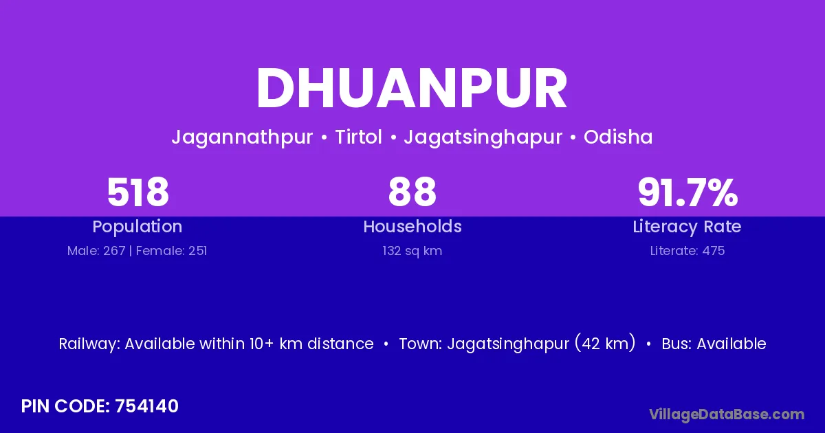 Jagatsinghapur (42 km) is the nearest town to Dhuanpur village for major economic activities and is located approximately 42 km away.