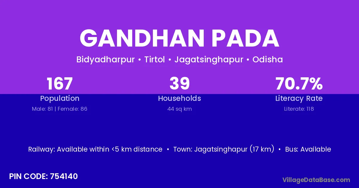 Jagatsinghapur (17 km) is the nearest town to Gandhan Pada village for major economic activities and is located approximately 17 km away.
