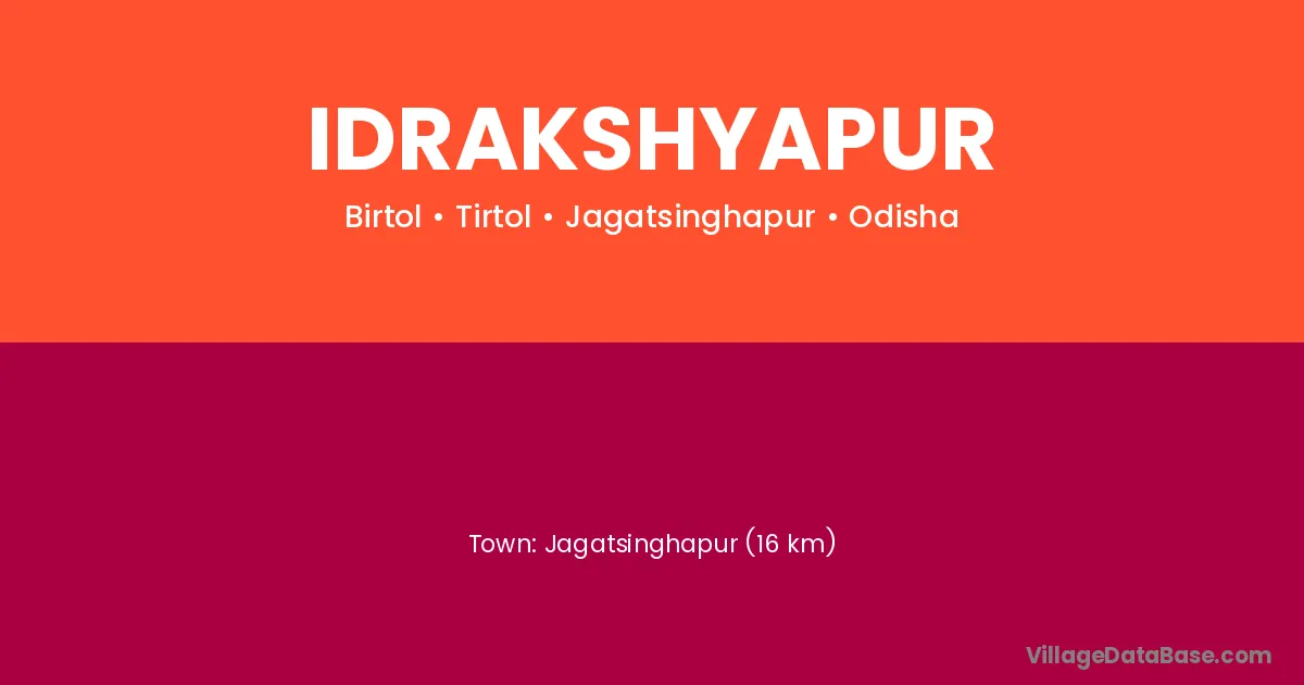 Jagatsinghapur (16 km) is the nearest town to Idrakshyapur village for major economic activities and is located approximately 16 km away.