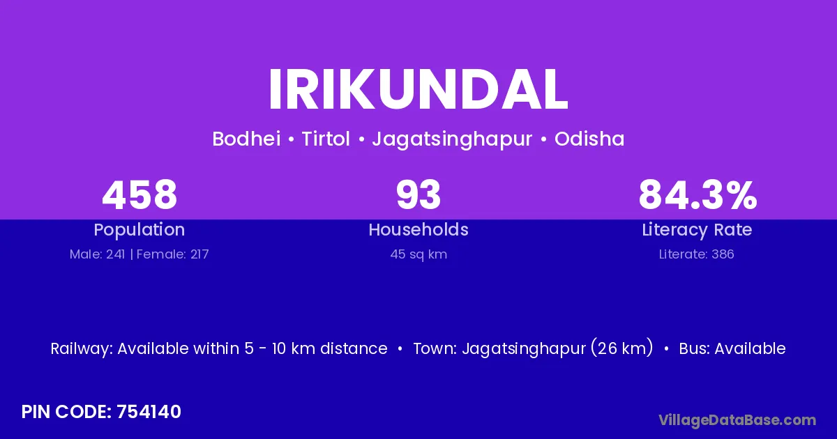 Jagatsinghapur (26 km) is the nearest town to Irikundal village for major economic activities and is located approximately 26 km away.