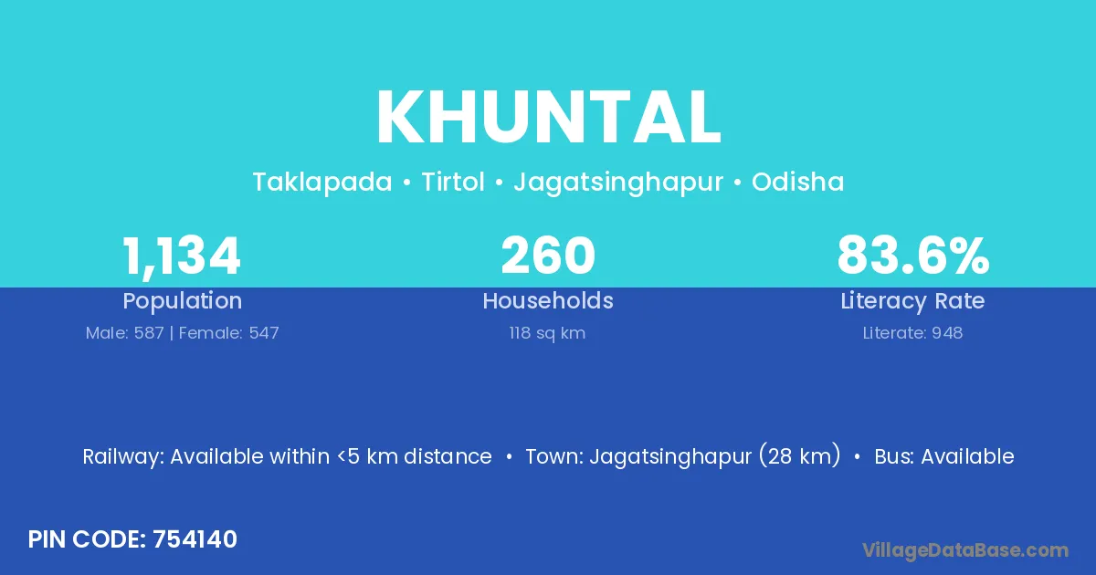 Jagatsinghapur (28 km) is the nearest town to Khuntal village for major economic activities and is located approximately 28 km away.