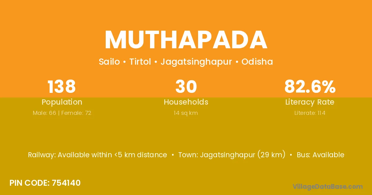 Jagatsinghapur (29 km) is the nearest town to Muthapada village for major economic activities and is located approximately 29 km away.